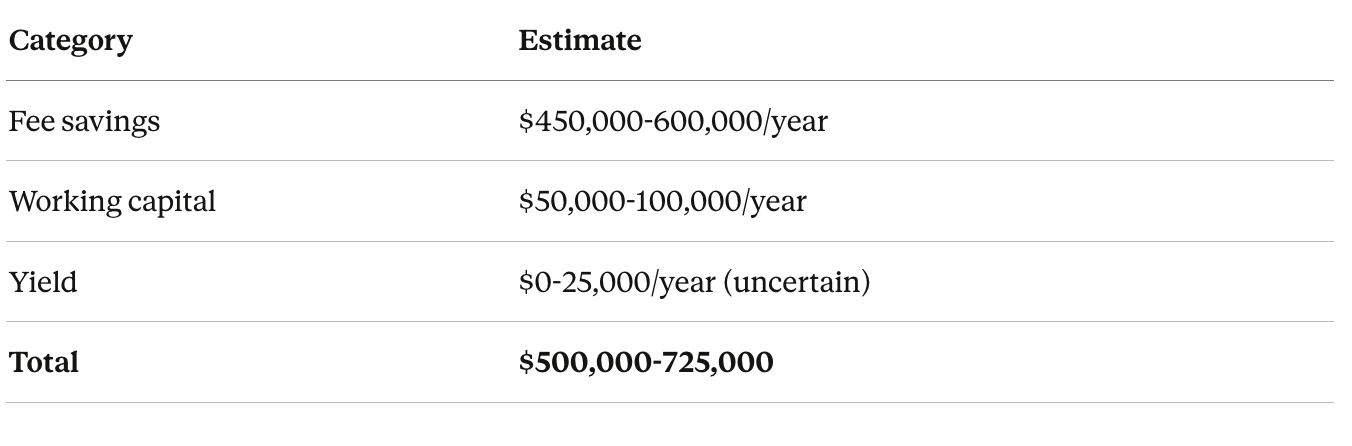 Treasury optionality: Cash on hand can earn yield in stablecoin products, though this benefit is in regulatory limbo. The CLARITY Act draft would prohibit exchanges from paying yield on balances.⁷ Yield capture is speculative; the working capital velocity benefit persists regardless.