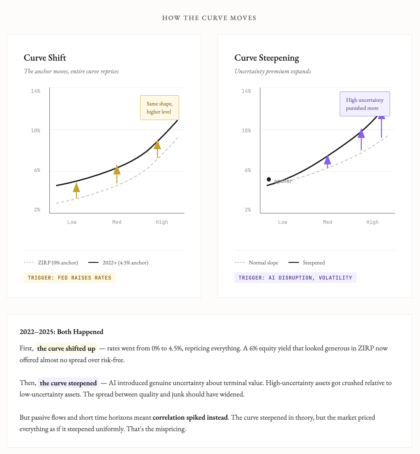 When spreads compress against risk-free, you have to believe a lot. Right now the market is believing much less for most SaaS. AI introduced real uncertainty about survivability and terminal value. Combined with passive flows and impatient capital, it’s a recipe for disorderly repricing.